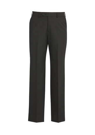 - Flat front, straight through the leg. Waistband with stretch fusing. Internal security pocket on right front pocket, and two rear pockets.